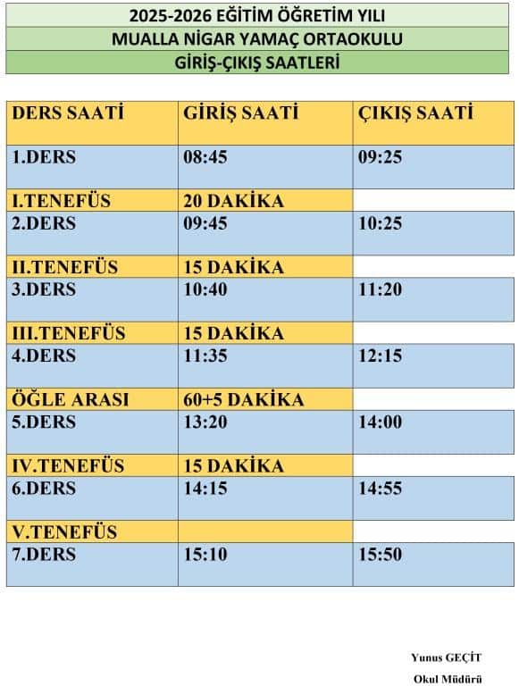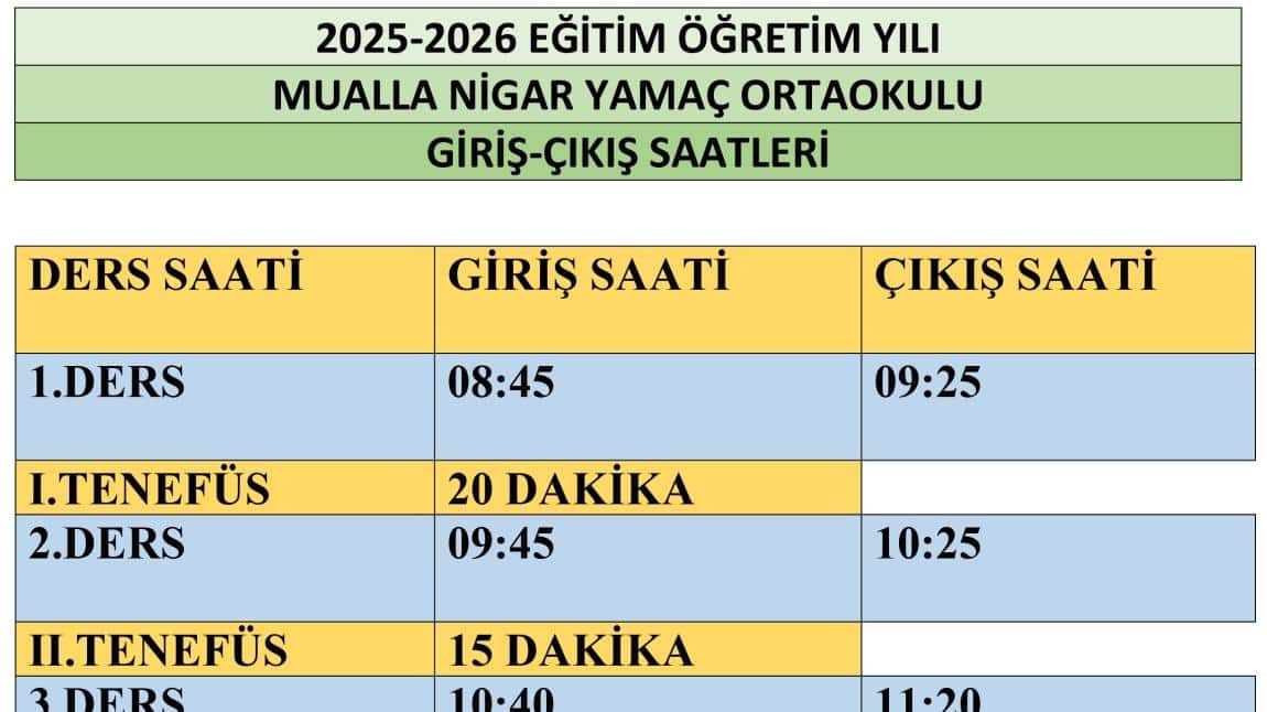 2025-2026 EĞİTİM ÖĞRETİM OKUL GİRİŞ ÇIKIŞ SAATLERİ
