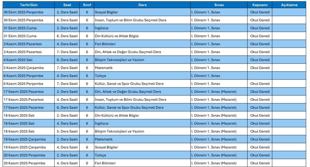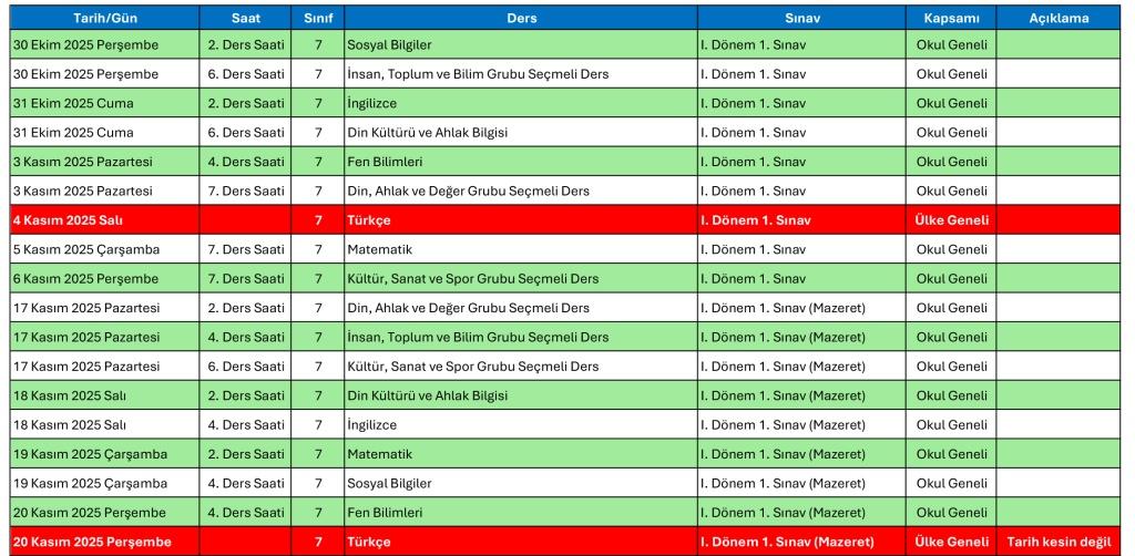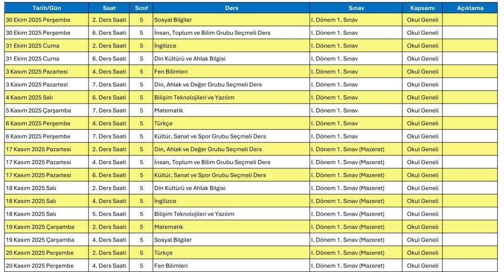 2025-2026 Eğitim ve Öğretim yılı ortak sınav tarihlerinin tamamının yer aldığı Exel dosyasına ulaşmak için tıklayınız.