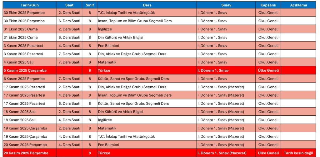 Okulumuz ortak sınav tarihleri Genel Tablosu ve her sınıf düzeyindeki tabloları aşağıda verilmiştir.